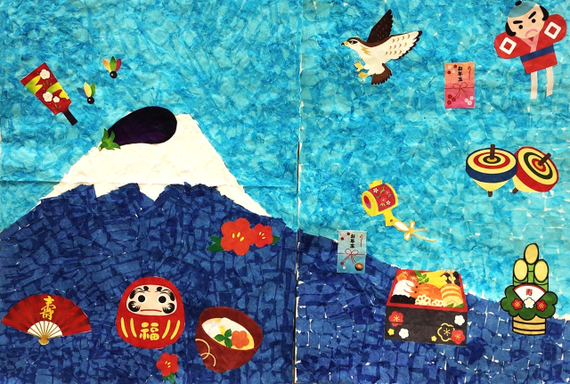 さて1月の壁紙は富士山を作りました。おせち料理や凧の絵を貼る際には、皆さんで「ここはどう?もう少しこっちかな?」とアイデアを出し合いながら協力して貼っておられました。