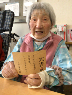 季節の行事では、今年もはるか神社が登場!皆様順番にお参りされました。お参りの後はおみくじを引き、大吉・中吉など様々な結果を笑顔で伝えてくれました。