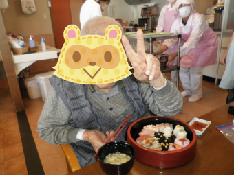 毎月恒例の昼食会を4月12日に行いました。 今回のメニューは皆さんが大好きなお寿司が 出ました!! マグロ、エビ、穴子、巻きずし等 皆さんの好きなネタが沢山と 皆さん「美味しい~」と笑顔いっぱいになりました。 今回、お寿司と言う事でデザートに素敵な 和菓子もありました。 いっぱい食べて皆さんのお腹も満たされ、 ダイニングでは利用者様の笑顔でいっぱい になりました。 5月の昼食会もどんなお食事が出るか楽しみですね!!