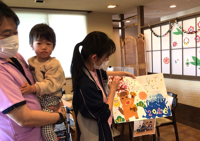 院内の託児所「こはる保育園」からは、大きな手作り年賀状をもって、小さな子供たちが新年の挨拶に訪れ、入居者皆さんの心を和ましてくれていました♪
