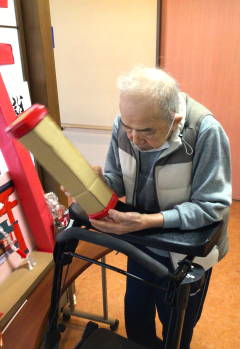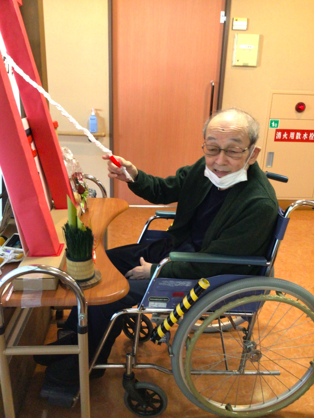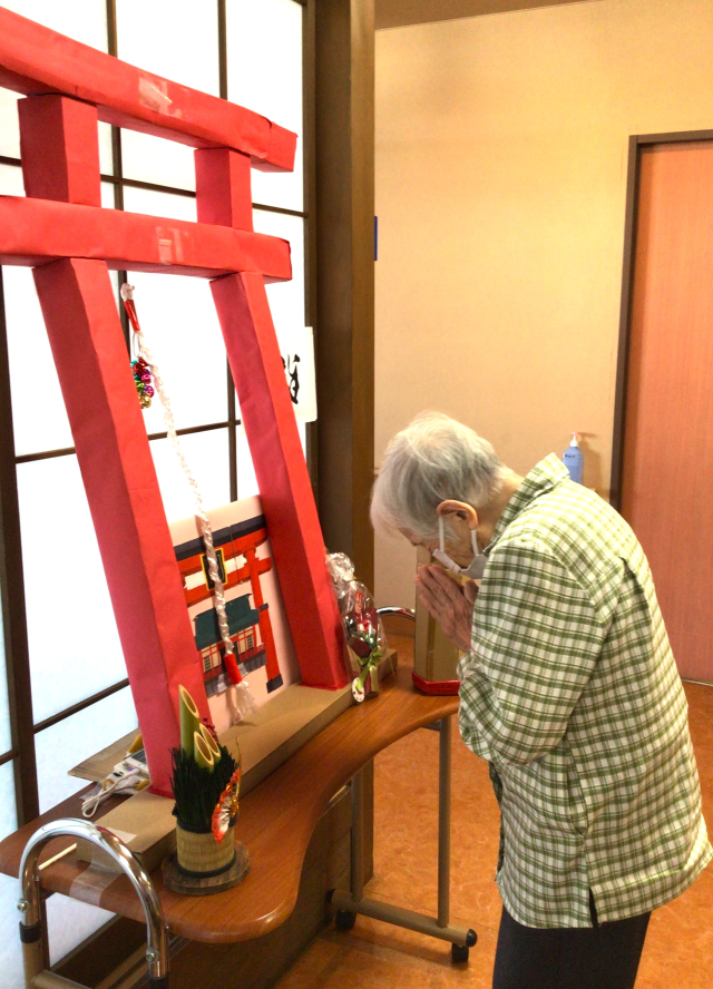 はるかの郷では暖かい室内において、手作りによる「はるか神社」で初詣を行いました。参拝では鐘を鳴らして、今年1年の健康と幸せなど、想い想いの願い事を祈願されていました。